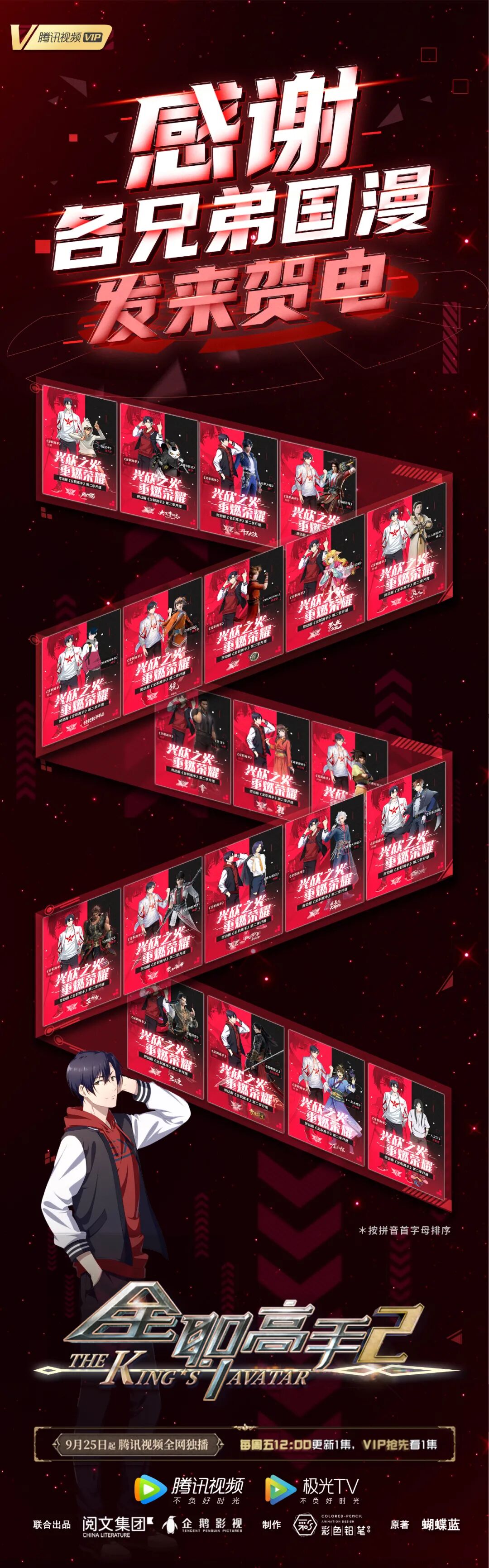 第一集就热血高能名场面不断!紧张的心,催更的手,喊出那句最统一的真实呼声:“Gkd,Gkd!”寄托着共同的热血激情、青春斗志、梦想战魂,《全职高手》是无数人心中的青春记忆,也是国漫发展道路上浓墨重彩的一笔。同样传递着积极力量的“国漫天团”在今日共同为动画《全职高手》第二季的开播送上祝福。不仅有《斗罗大陆》《斗破苍穹》《一人之下》《狐妖小红娘》《大理寺日志》《灵笼》《凡人修仙传》等大热IP,更有《我为歌狂》《秦时明月》等经典IP联合为《全职高手》在线打call,力邀更多人一起共燃热血梦想。